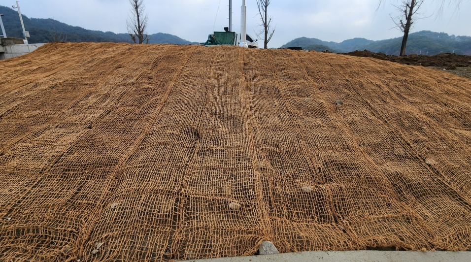 벌거벗은 언덕을 덮는 코코넛 섬유망은 천연 코코넛 섬유로 만든 제품으로 내구성과 생분해성이 뛰어나 지속 가능한 방식으로 토지를 보호하는 데 도움을 줍니다